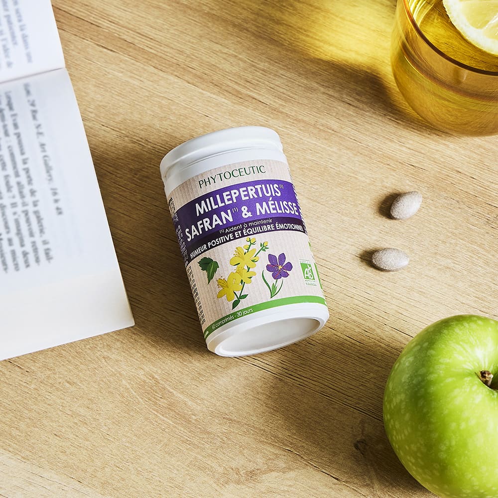 Συστατικά | Extrait de sommités fleuries de Millepertuis* (Hypericum perforatum L.) ; agent de charge : gomme d’acacia* ; sirop de riz déshydraté* ; stabilisant : citrate de calcium ; anti-agglomérants : carbonate de magnésium et talc ; extrait sec de stigmates de Safran* (Crocus sativus L.) ; extrait sec de feuilles de Mélisse* (Melissa officinalis L.) ; huile de tournesol*. * Ingrédients issus de l’Agriculture Biologique. Sans dioxyde de silicium |